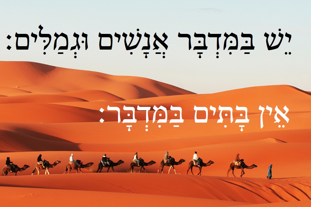 מַה־יֵּשׁ בַּמִּדְבָּר? יֵשׁ אֲנָשִׁים וּגְמַלִּים בַּמִּדְבָּר: יֵשׁ בַּמִּדְבָּר אֲנָשִׁים וּגְמַלִּים: הֲיֵשׁ בָּתִּים? אַיִן, אֵין בָּתִּים בַּמִּדְבָּר: