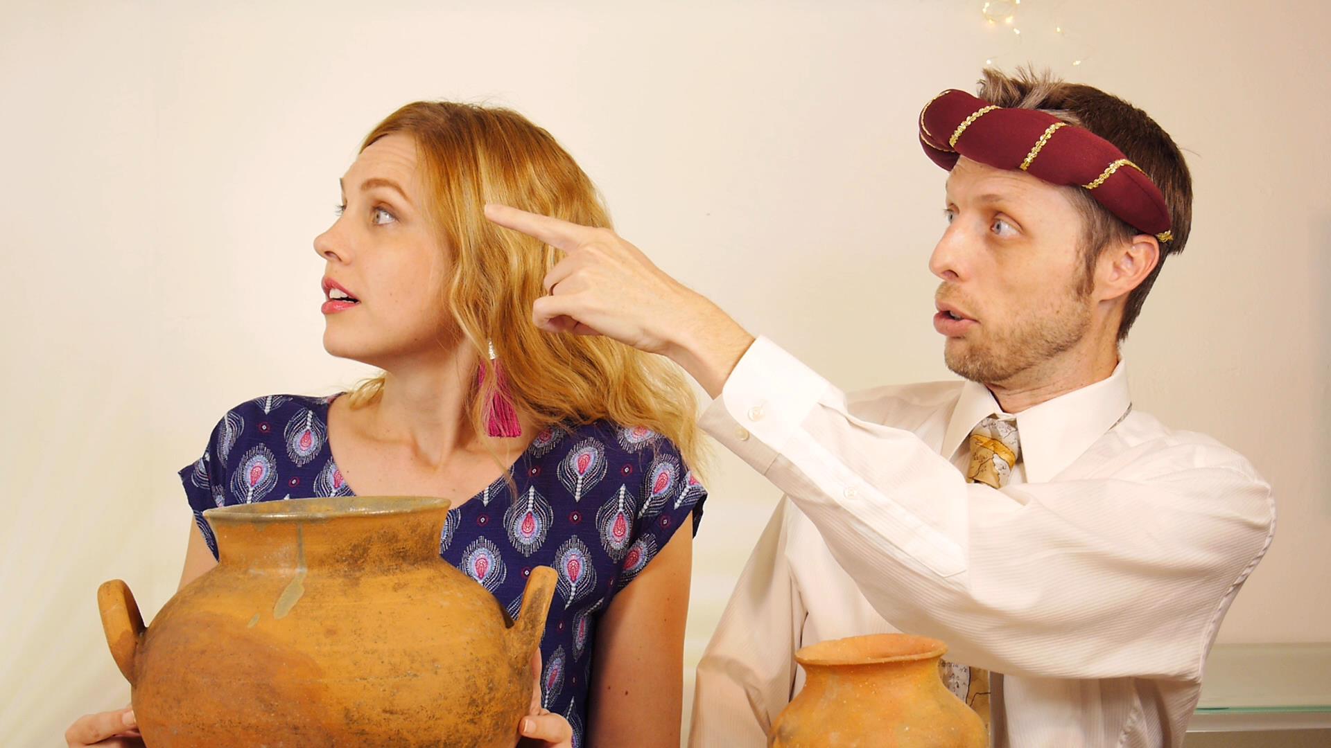 אַבְרָם 🗨 הֲיֵשׁ־לָךְ כַּד? בֵּת 🗨 אֵין־לִי כַּד: אֵין־לִי דָּבָר: